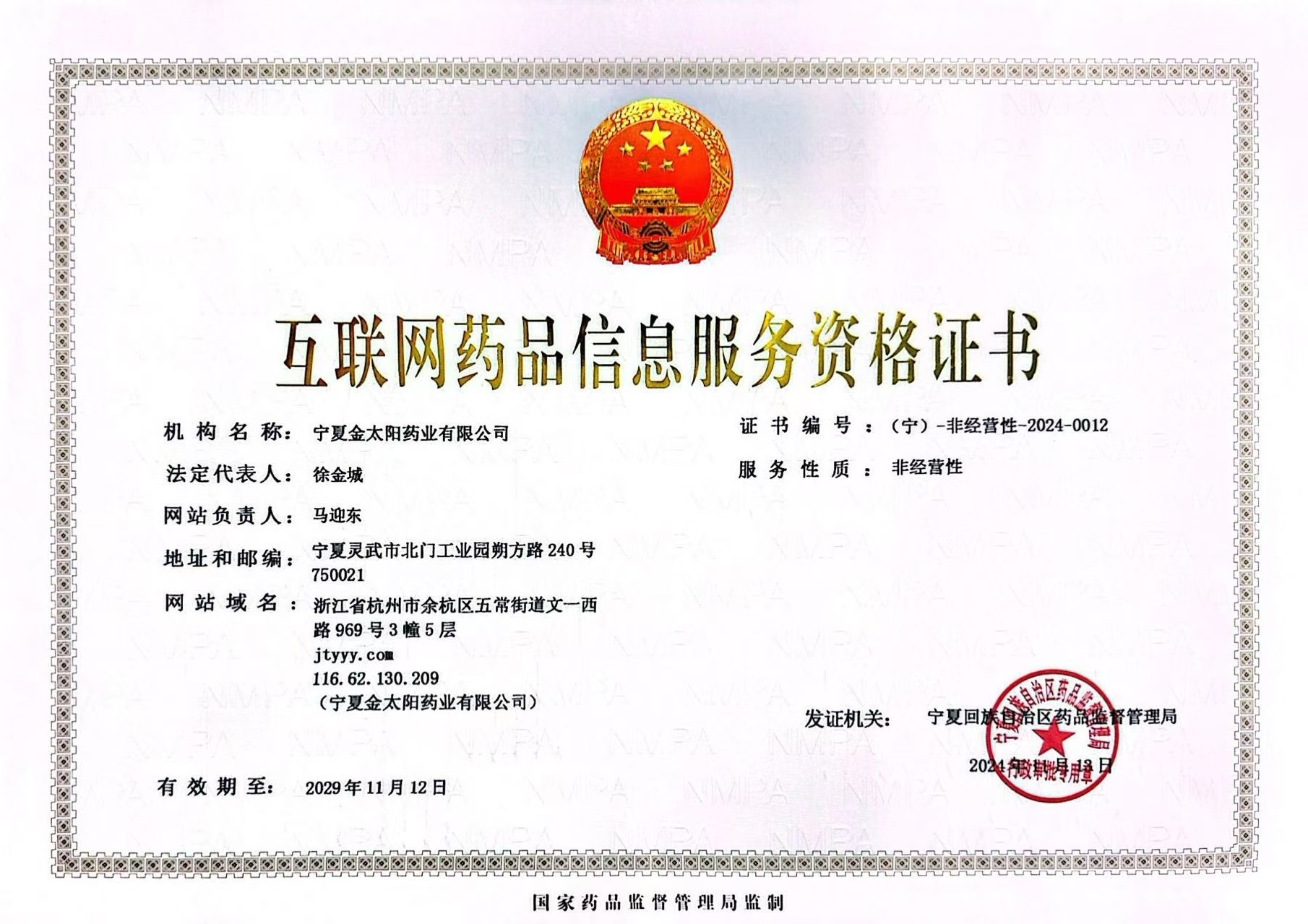 寧夏金太陽(yáng)藥業(yè)有限公司 互聯(lián)網(wǎng)藥品信息服務(wù)資格證書(shū)  證書(shū)編號(hào):(寧)-非經(jīng)營(yíng)性-2019-0005 …